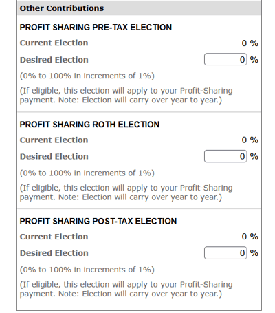 Please note: Unless you are a resident of Puerto Rico or a participant in the UK Stakeholder Plan, you are able to defer all or part of your Profit Sharing as a pre-tax election, post-tax election or as a Roth Election. The following is a snapshot of the Fidelity Manage Contributions page available from the home page of the www.netbenefits.fidelity.com website, which provides examples of the options available to U.S. based employees.